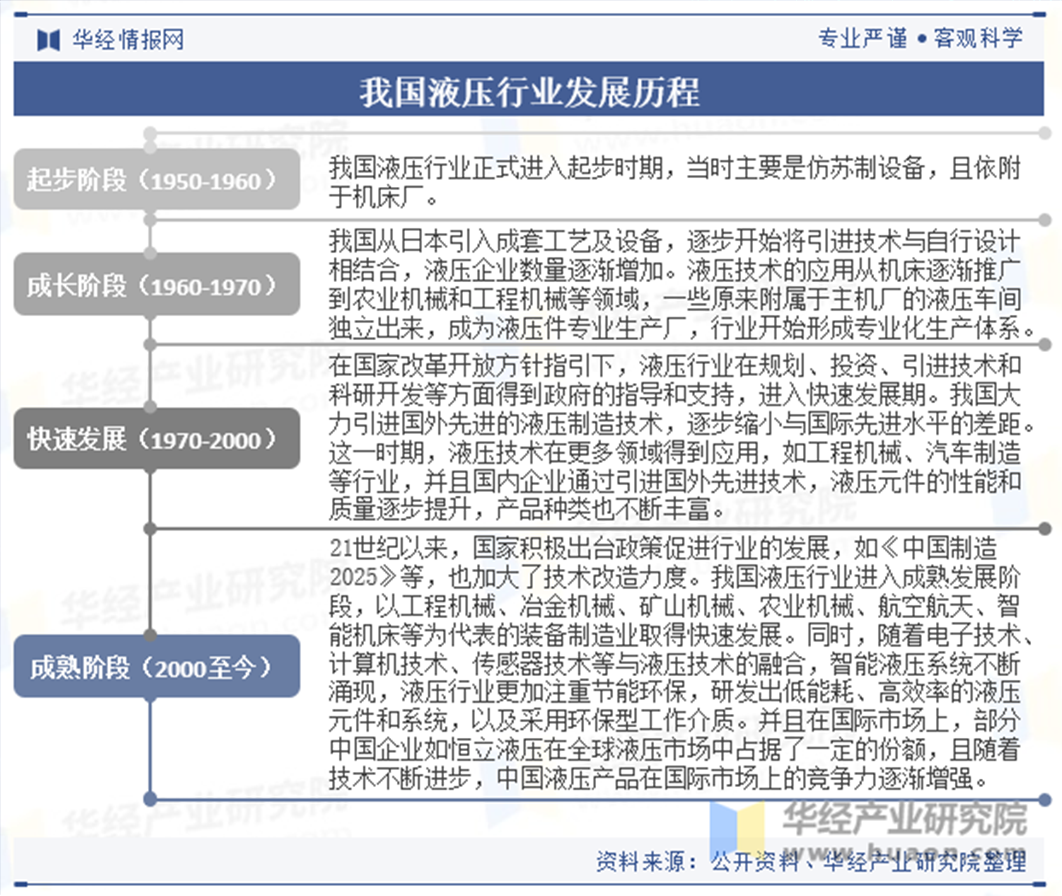我国液压产业起步晚,基础薄弱。建国以前我国几乎无液压工业可言,仅在压力机和机床等领域有极少液压元件使用。建国后,国内液压行业大致经历四个发展阶段,即起步阶段、专业化生产体系成长阶段、快速发展阶段和成熟发展阶段。经过多年的努力,我国液压行业的整体技术水平得以大幅提升。