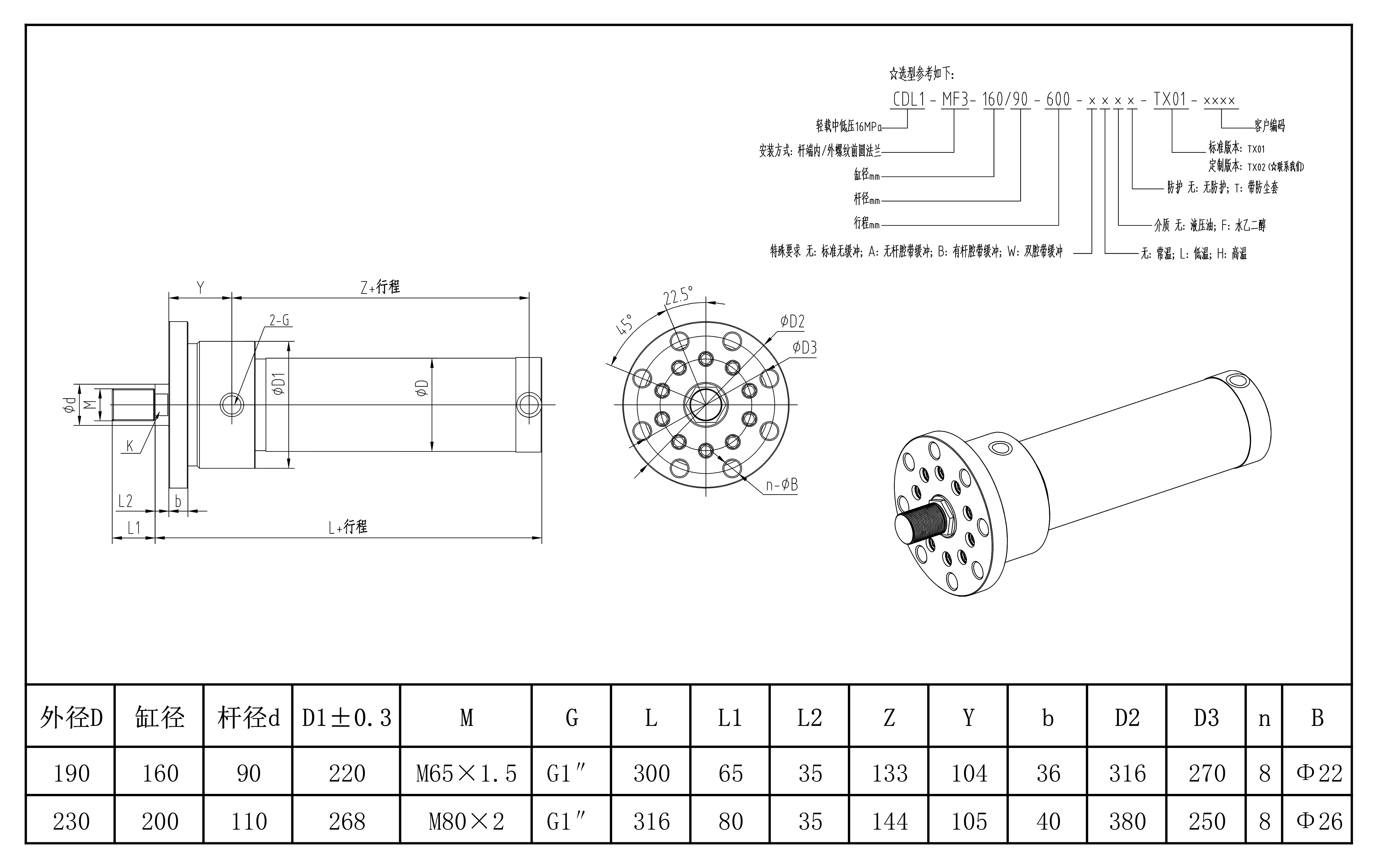 安装形式:MF3 AL-φ160-200mm 杆端外螺纹前圆法兰 压力:28MPa (特殊压力等级可定制) 内径:Φ160 Φ200 轻量化设备、尺寸小重量轻、负载小、压力较低的场合 采用进口12.9级的螺栓、采用进口密封件、采用45#调质缸筒、42CrMo调质活塞杆 可选装防尘套;可选装位移传感器,位置开关;可调缓冲等。 其他特殊应用,如:耐高温、耐低温、耐腐蚀、特殊介质等需求均可定制。