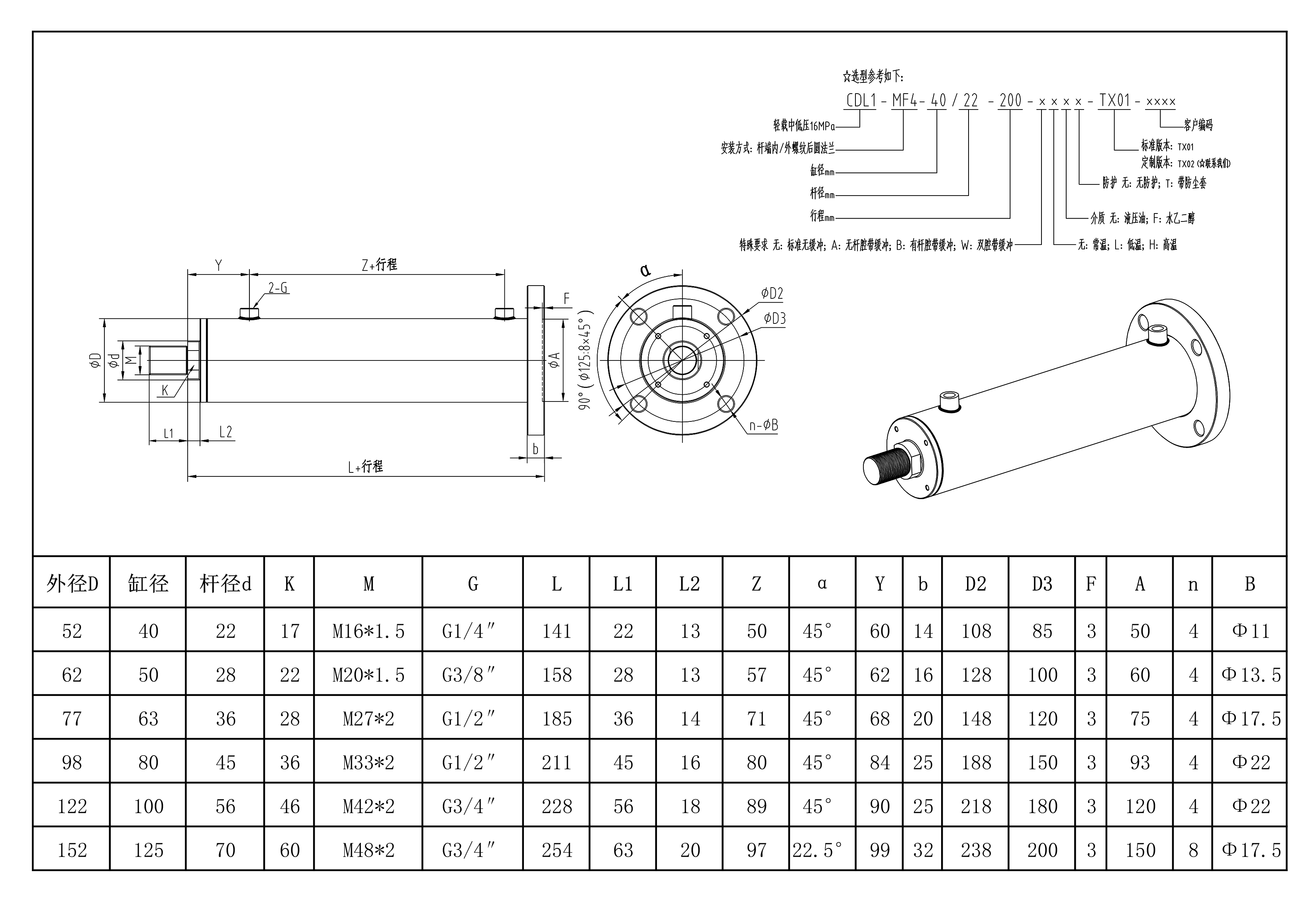 安装形式:MF4 AL-φ 40-125mm 杆端外螺纹后圆形法兰 压力:28MPa (特殊压力等级可定制) 内径:Φ40 Φ50 Φ63 Φ80 Φ100 Φ125 轻量化设备、尺寸小重量轻、负载小、压力较低的场合 采用进口12.9级的螺栓、采用进口密封件、采用45#调质缸筒、42CrMo调质活塞杆 可选装防尘套;可选装位移传感器,位置开关;可调缓冲等。 其他特殊应用,如:耐高温、耐低温、耐腐蚀、特殊介质等需求均可定制。
