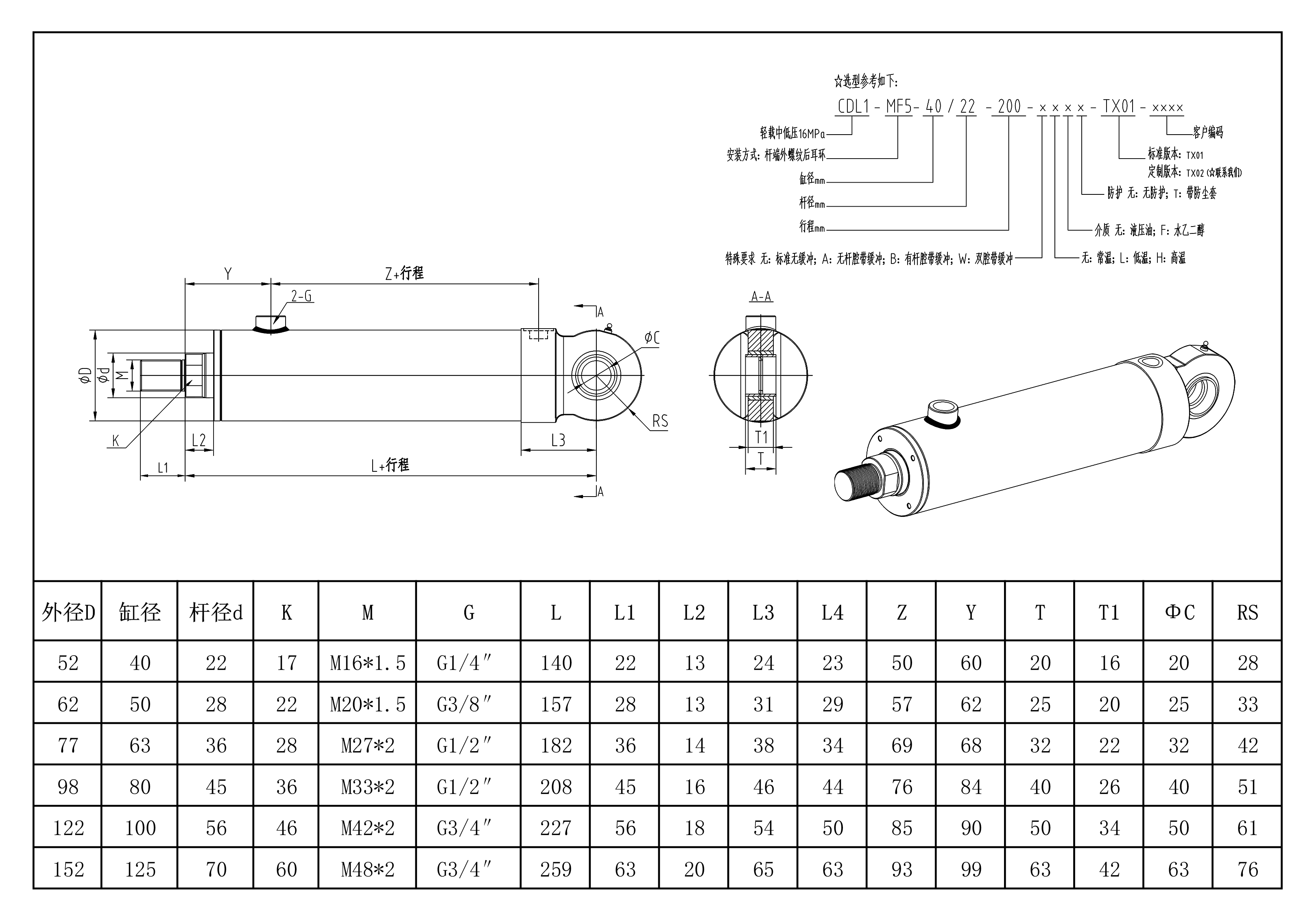 安装形式:MP5 AL-φ40-125mm1 杆端外螺纹后耳环 压力:28MPa (特殊压力等级可定制) 内径:Φ40 Φ50 Φ63 Φ80 Φ100 Φ125 轻量化设备、尺寸小重量轻、负载小、压力较低的场合 采用进口12.9级的螺栓、采用进口密封件、采用45#调质缸筒、42CrMo调质活塞杆 可选装防尘套;可选装位移传感器,位置开关;可调缓冲等。 其他特殊应用,如:耐高温、耐低温、耐腐蚀、特殊介质等需求均可定制。