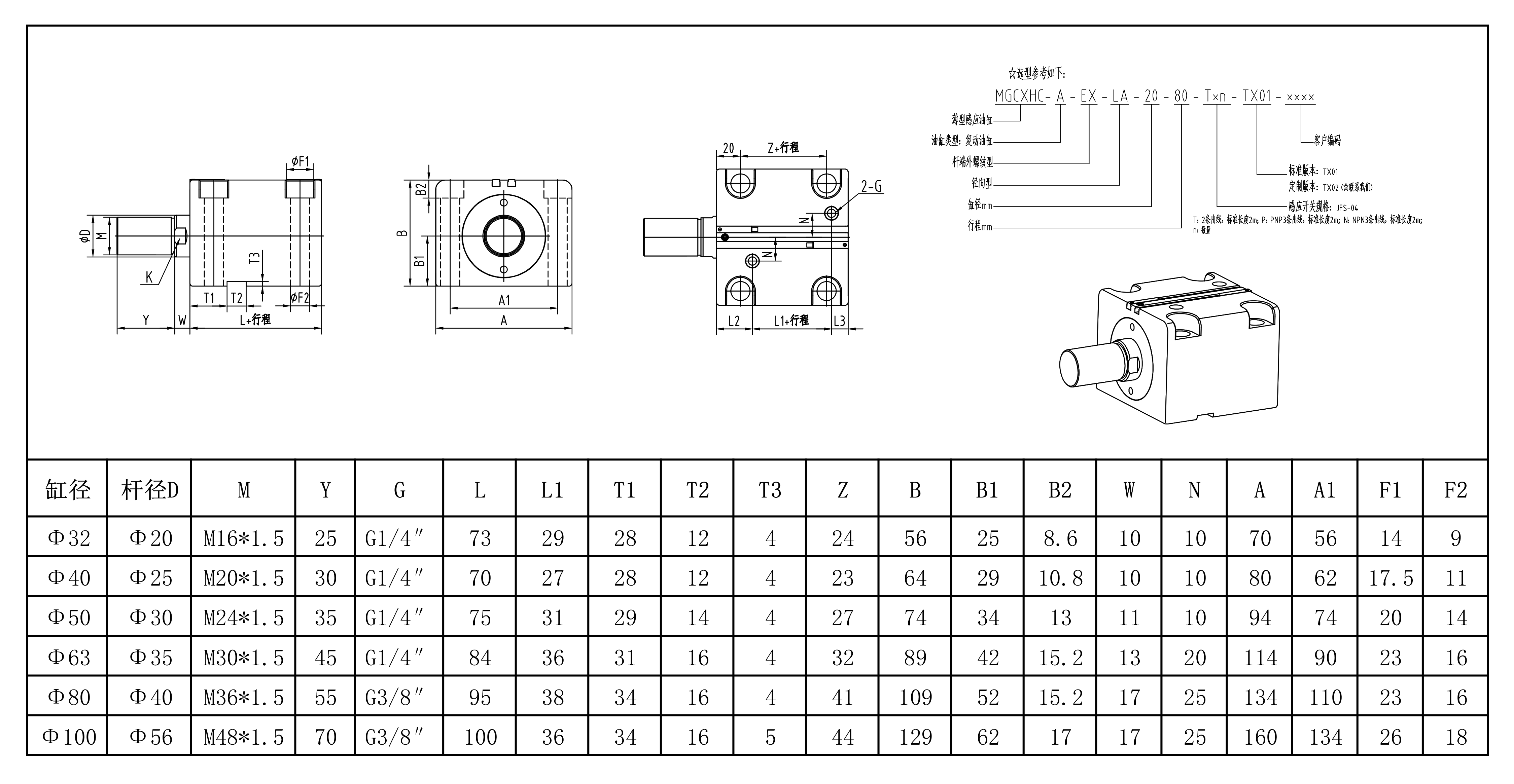 安装形式:LA外螺纹感应式(双作用单活塞杆)