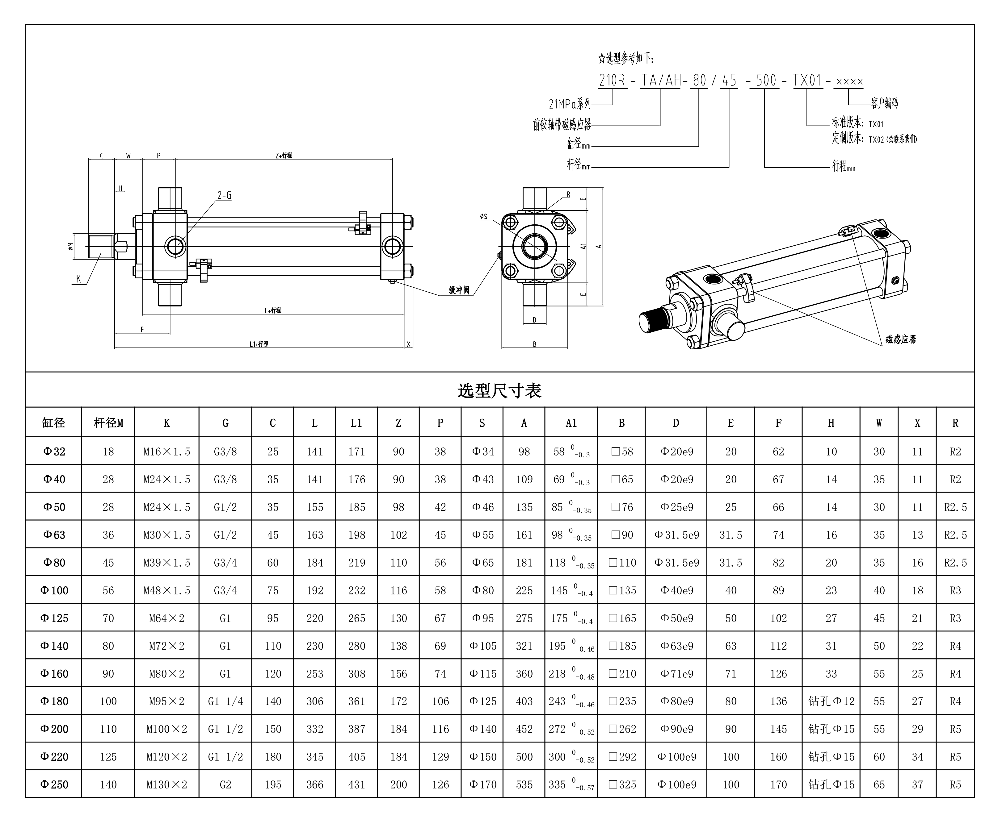 安装形式:TA前铰轴 压力:21MPa (特殊压力等级可定制) 内径:Φ32 Φ40 Φ50 Φ63 Φ80 Φ100 Φ125 Φ140 Φ160 Φ180 Φ200 Φ220 Φ250 缸体为304/316L不锈钢材质,端盖、活塞杆、拉杆均为合金钢材质调质处理;活塞杆表面镀硬铬,端盖表面发黑;内部带双感应磁环,台湾品牌磁感应开关;全套选用进口密封圈。 可选装防尘套。 其他特殊应用,如:耐高温、耐低温、耐腐蚀、特殊介质等需求均可定制。