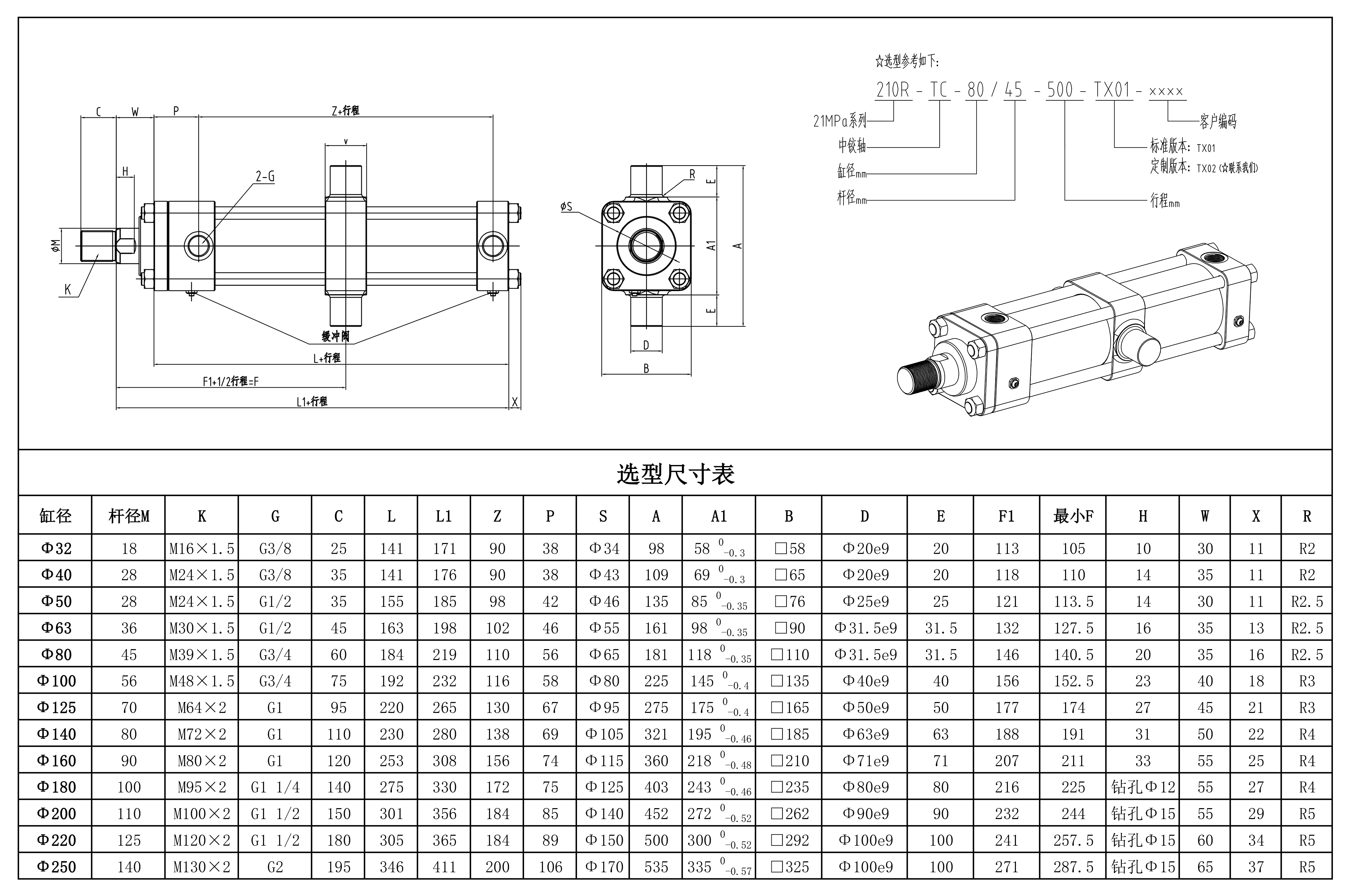 安装形式:TC中间铰轴 压力:21MPa (特殊压力等级可定制) 内径:Φ32 Φ40 Φ50 Φ63 Φ80 Φ100 Φ125 Φ140 Φ160 Φ180 Φ200 Φ220 Φ250 缸体为27SiMn材质,端盖、活塞杆、拉杆均为合金钢材质调质处理;活塞杆表面镀硬铬,端盖表面发黑;带可调缓冲;全套选用进口密封圈。 可选装防尘套。 其他特殊应用,如:耐高温、耐低温、耐腐蚀、特殊介质等需求均可定制。