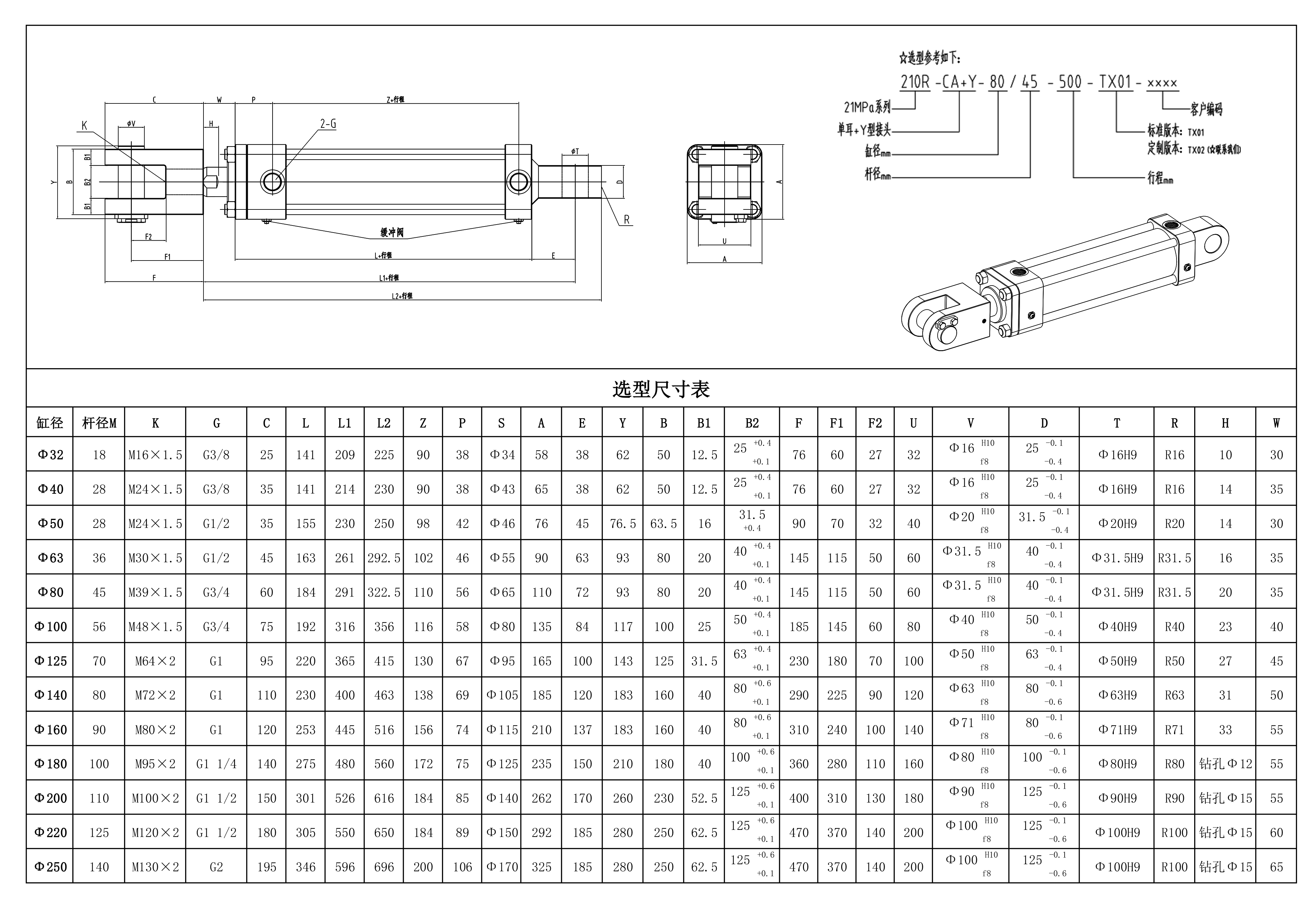安装形式:CA单耳+Y接头 压力:21MPa (特殊压力等级可定制) 内径:Φ32 Φ40 Φ50 Φ63 Φ80 Φ100 Φ125 Φ140 Φ160 Φ180 Φ200 Φ220 Φ250 缸体为27SiMn材质,端盖、活塞杆、拉杆均为合金钢材质调质处理;活塞杆表面镀硬铬,端盖表面发黑;带可调缓冲;全套选用进口密封圈。 可选装防尘套。 其他特殊应用,如:耐高温、耐低温、耐腐蚀、特殊介质等需求均可定制。